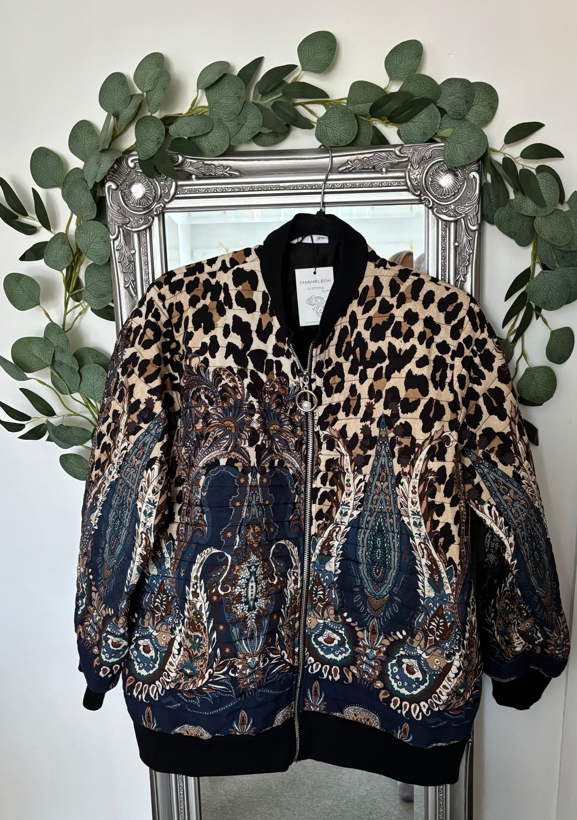 Prepare to be noticed in this fabulous animal/paisley print, quilted bomber jacket with zip fastening, side pockets and black contrast trim to the neck, hem and cuffs.