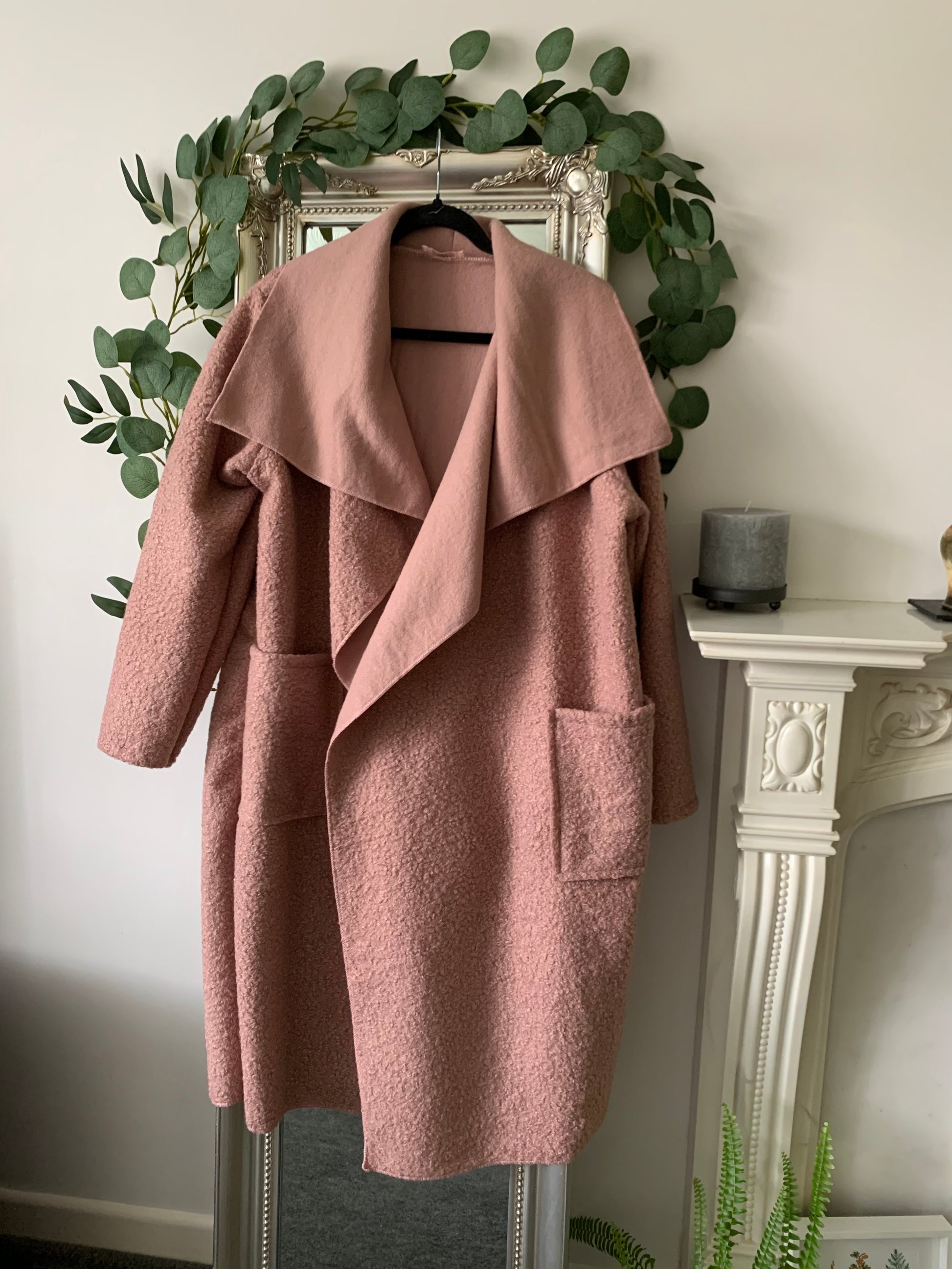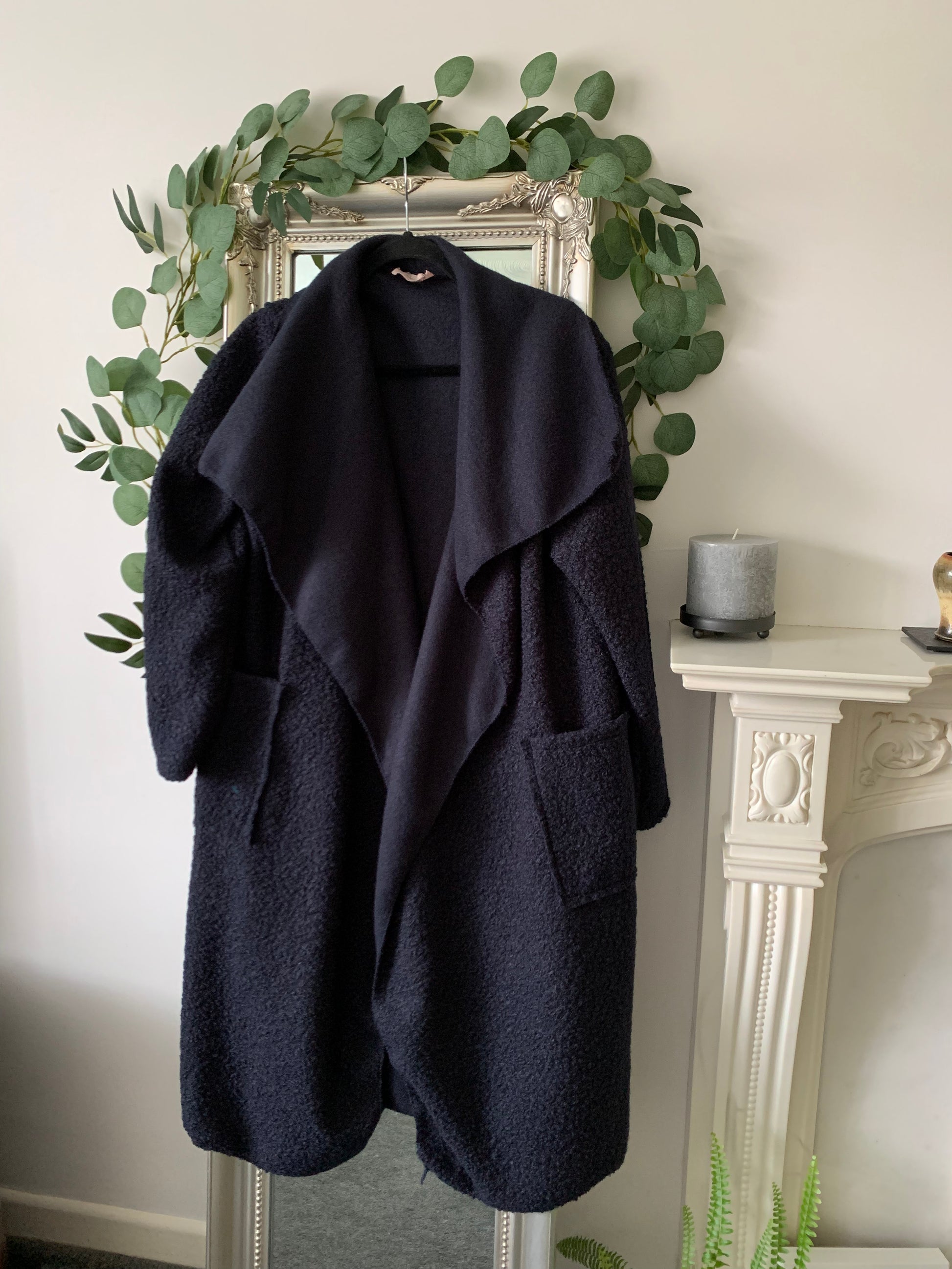 This fabulous edge to edge, waterfall front coat comes in this gorgeous faux Astrakhan type fabric, has 2 patch pockets and is warm, stylish and washable! Great for layering and dressing up or down.