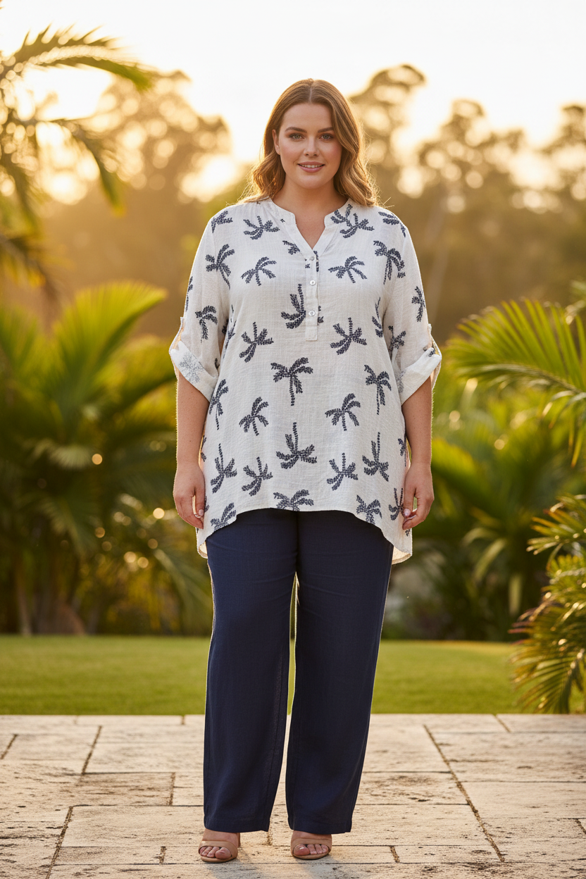 Cool and comfortable cotton, plus size, palm tree print shirt with 3 button opening and adjustable sleeves.