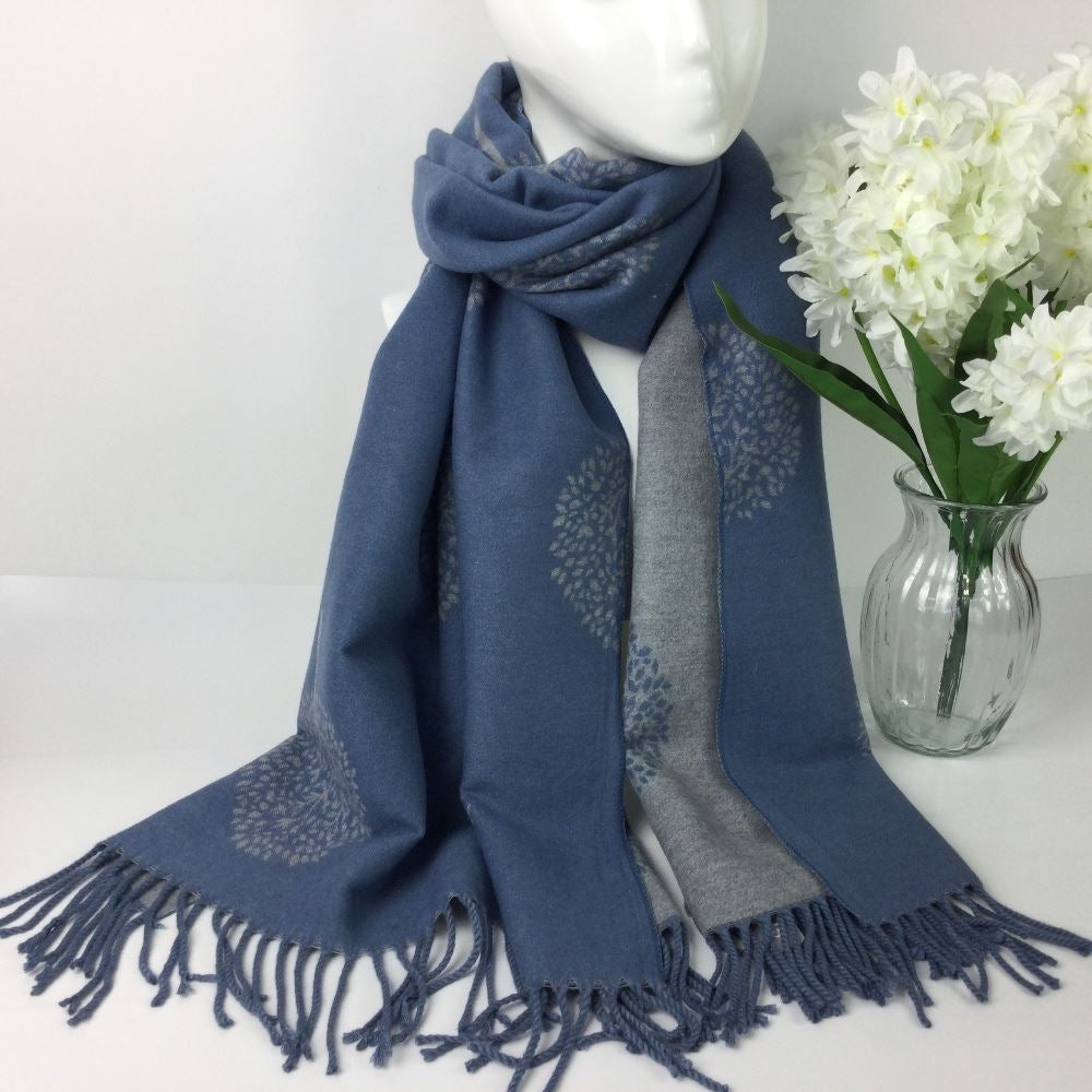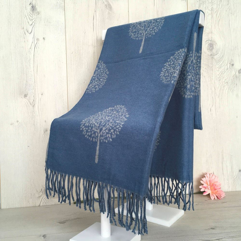 Stunning, super soft, cashmere blend, reversible pashmina/wrap in a beautiful Tree of Life print. Fabric is 30%Cashmere/70%Viscose. Washable. Approximate size is 25" x 76" excluding fringe. Price does not include the scarf ring shown. These are sold separately